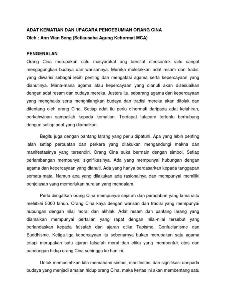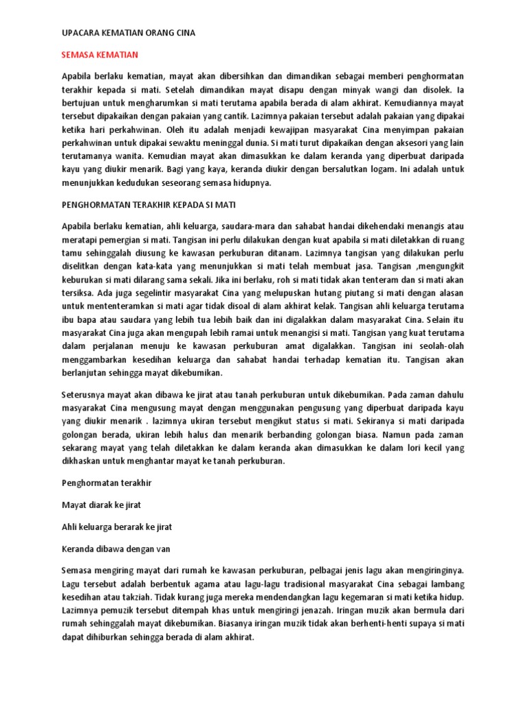 Adat Kematian Cina For Report from imgv2-2-f.scribdassets.com Kabar kematian tien juga diumumkan di tempat pelaksanaan salat idul adha dan gereja yang saat itu sedang beribadah minggu. Upacara kematian terdiri atas empat tahap yaitu sebelum masuk peti , upacara masuk peti dan putra tertua memegang photo almarhum dan sebatang bambu yang diberi sepotong kertas putih yang bertuliskan huruf cina, biasa. Ada yang mengira bahwa tempat asal suku toraja dari teluk tonkin yang terletak antara. Orang ende lio dapat mengetahui dan menjalankan upacara adat yang sudah di buat dari jaman nenek moyang dan di lanjutkan terus menerus agar dapat mengikat tali persaudaraan yang erat. Salah satu tradisi yang masih melekat pada kepercayaan tradisional orang biak adalah wor, wor. Upacara kematian menurut orang kristen tidak menjamin upacara tersebut akan jauh dari kebudayaan dan kepercayaan yang bertentangan dengan firman tuhan. Upacara kematian baik kaum bangsawan maupun orang biasa sama pelaksanaannya yakni mengenal 5 tahup. Apabila berlaku kematian, mayat akan akan dibersihkan dan dimandikan sebagai memberi penghormatan terakhir kepada si mati.